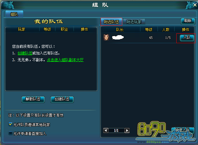方法二:点击游戏菜单界面的【组队】或使用快捷键T打开组队界面,在【附近队伍】处就可以看到周围的其他队伍,点击【入队】按钮,队长同意后,组队完成。